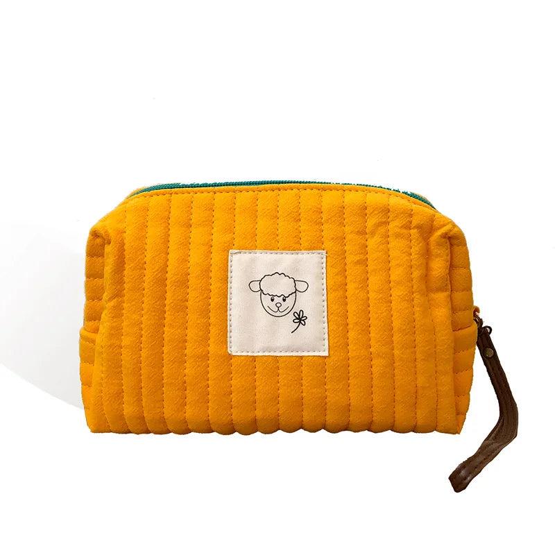 This quilted cosmetic bag is perfect for storing your makeup and toiletries while on the go. It is portable and convenient for travel.