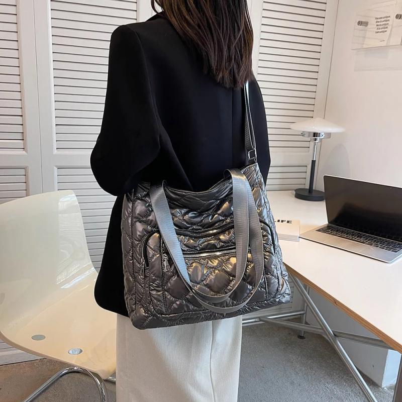 Stay stylish and practical with this quilted messenger bag made of waterproof nylon. Perfect for shopping, travel, and winter outings, it features a soft and warm design that's adjustable for your comfort.
