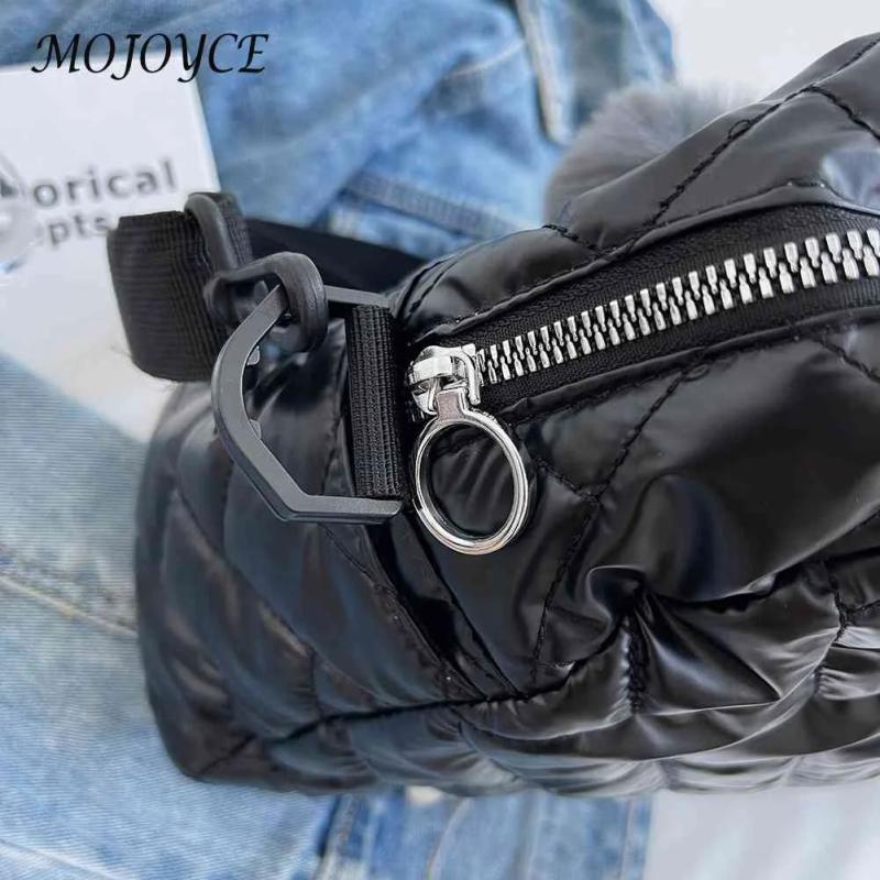 This stylish quilted shoulder bag features a fun pompom pendant and a large capacity design. Made of durable nylon, this crossbody bag is perfect for everyday use.