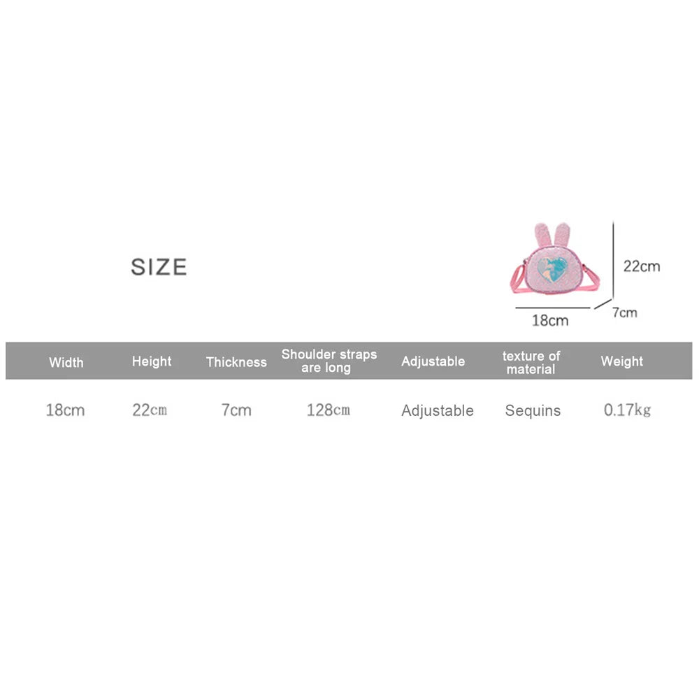 Description:Adorable children's bag with cartoon design and sparkly sequins. Perfect for little princesses to carry their essentials in style.Features: Features cute rabbit ears and sequin detailing Ideal for young girls who love princess themes Adjustable shoulder strap for comfortable wear Compact size perfect for storing small items Great gift idea...