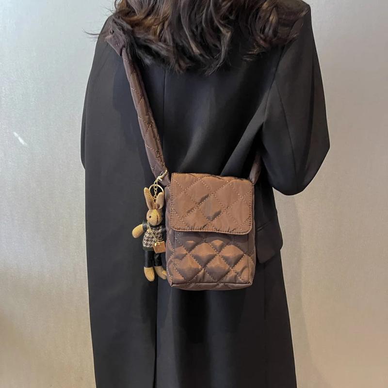 This flap shoulder bag is designed with rabbit toys, making it a playful and cute accessory perfect for weekend vacation. It features a rhombic lattice pattern and is made of soft cotton for casual comfort.