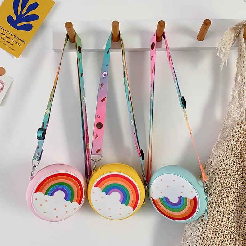 This adorable crossbody bag features a colorful rainbow print and a round donut design. It's perfect for children to carry their essentials while on vacation or a day out.
