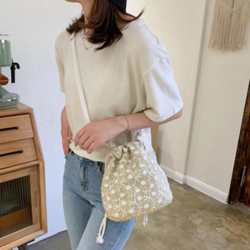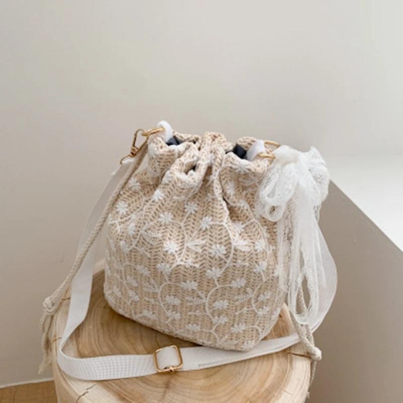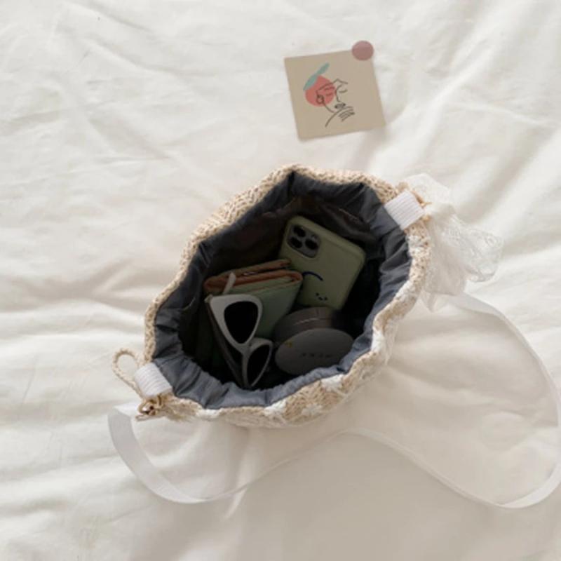 Rattan Shoulder Bag Lace Beach Straw Bucket Bag Retro Woven Bag