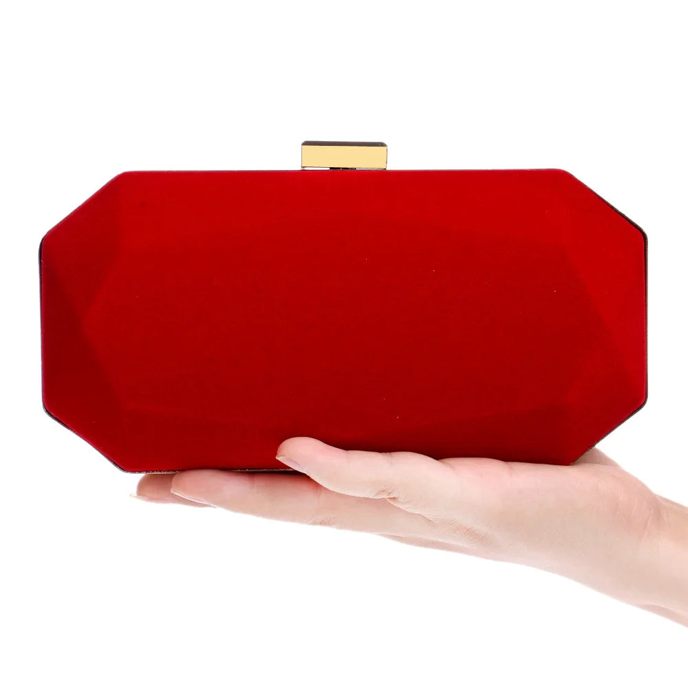 Elegant velvet evening bag in red and purple with a minimalist design, perfect for special occasions. This hand banquet bag is made of corduroy and features a sleek look.