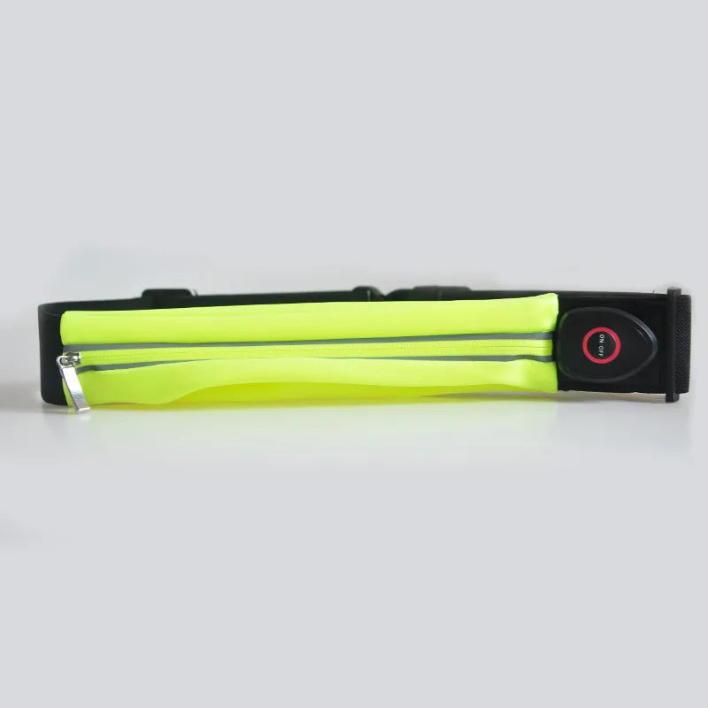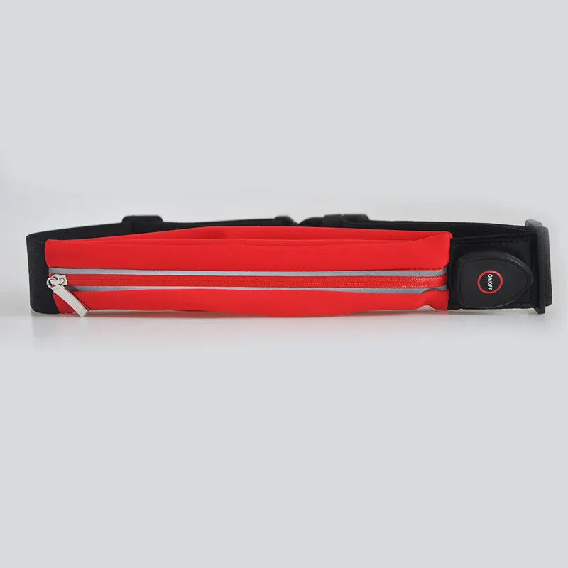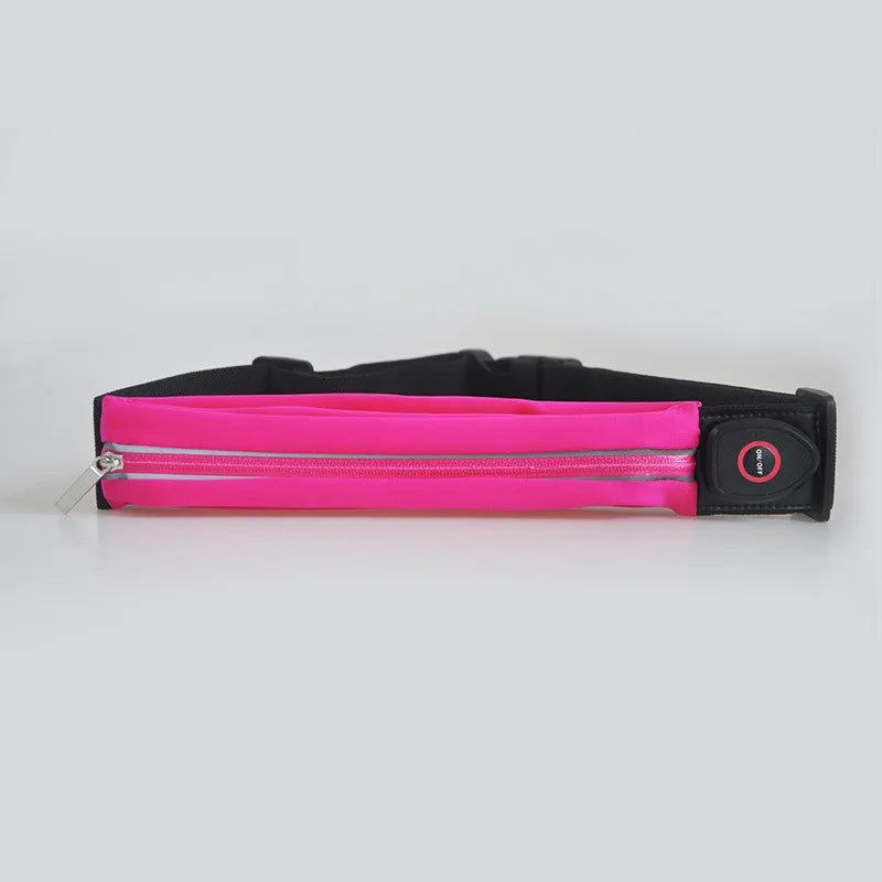 This pack belt sport bag is designed for running with a light and waterproof pouch, featuring reflective LED for safety.