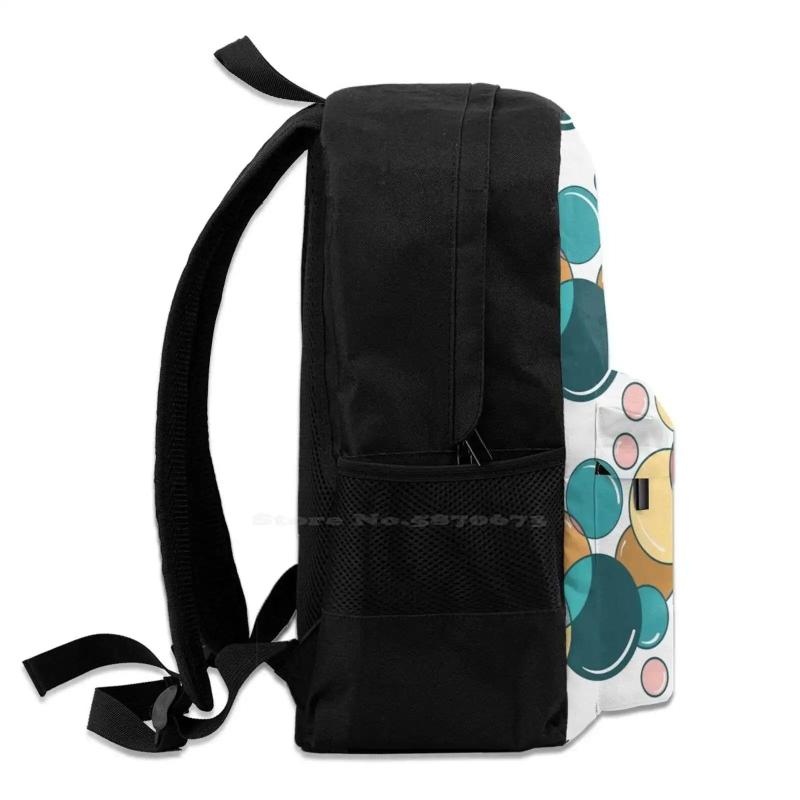 This stylish school bag for teenage girls features a retro bubbles design in teal, pink, and peach colors. Perfect for carrying laptops and traveling.