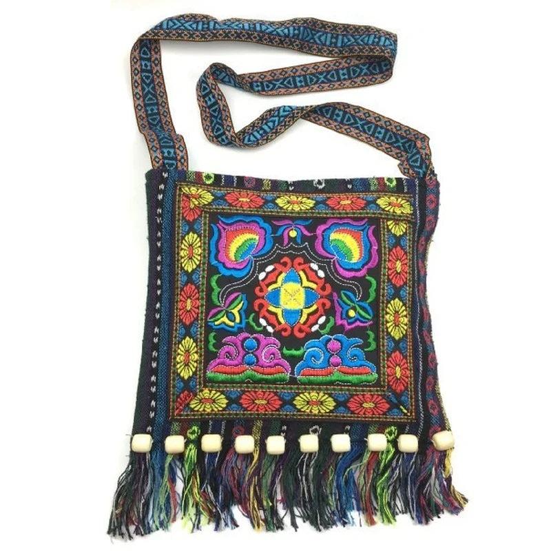 Boho-inspired tote messenger bag with retro embroidery design and ethnic tassel details.