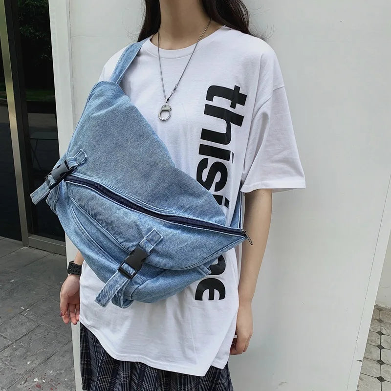 Stay stylish with this retro washed denim large bag. Perfect for street casual look, it offers a large capacity and can be worn as a one-shoulder or messenger bag. Made from durable canvas material.