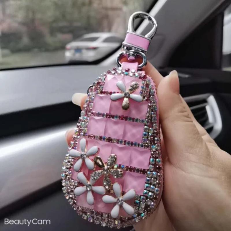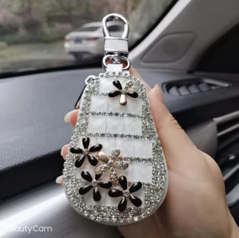 This stylish car key holder is adorned with rhinestones, featuring a flower design and crystal diamond keychains. Keep your keys secure and organized in this elegant key storage case.