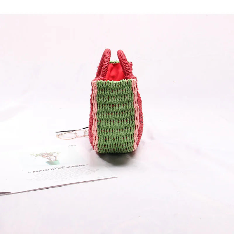 Enjoy your beach vacation with this hand-woven straw bag featuring a watermelon design. Perfect for carrying your essentials in style.