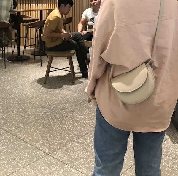 This ladies' milk-colored bag features a semi-circle design with a zipper closure, perfect for your essentials.