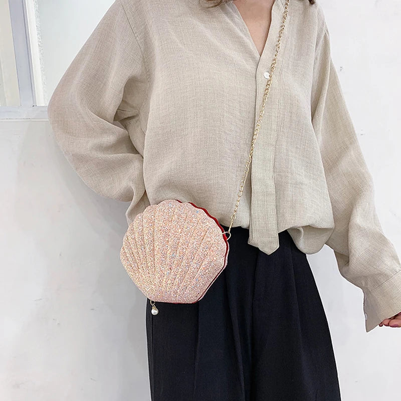 This stylish shoulder bag features sequin detailing and a unique shell design. Ideal for evening events, it adds a touch of personality to your outfit. The chain strap adds a trendy touch.