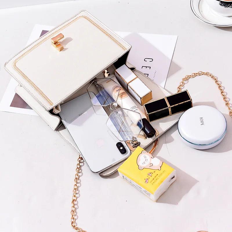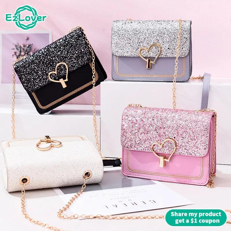 This stylish Sequin Pu leather bag features a love shape lock and a chain strap, perfect for girls who love a trendy and fashionable look.