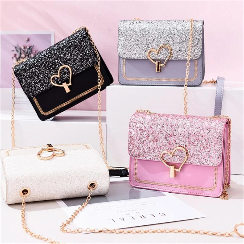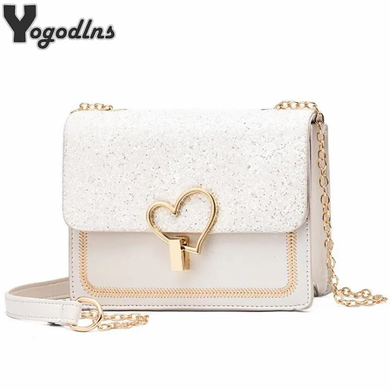 Sequin Pu Leather Female Bag Love Shape Lock Girls Chain Messenger Shoulder Bag
