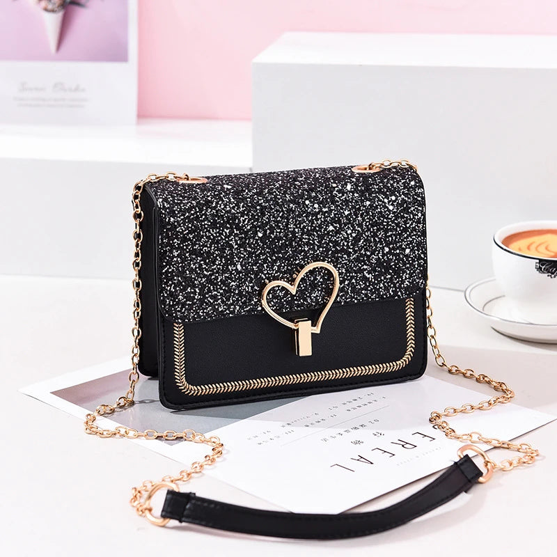 - Sequin Pu Leather Female Bag with Metal Love Shape Lock