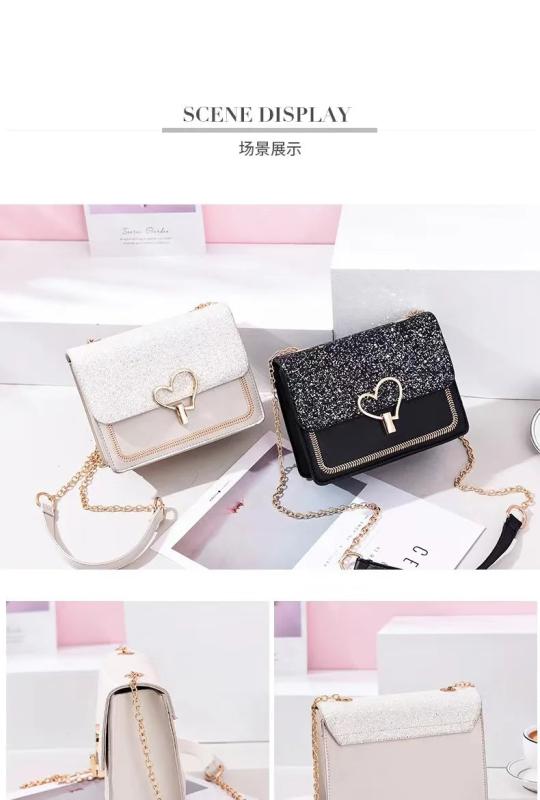 This stylish Sequin Pu Leather bag features a metal love shape lock design, perfect for girls. It comes with a chain shoulder strap for easy carrying.