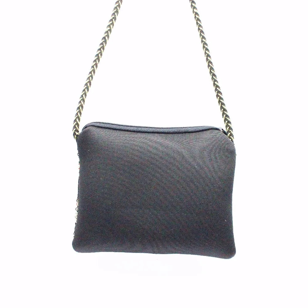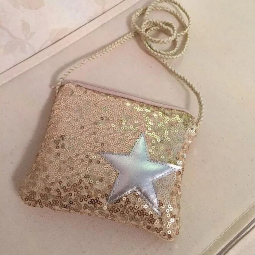 This children's bag features sequin-wrapped five-pointed star design. It is a stylish oblique satchel with a zipper for easy access.