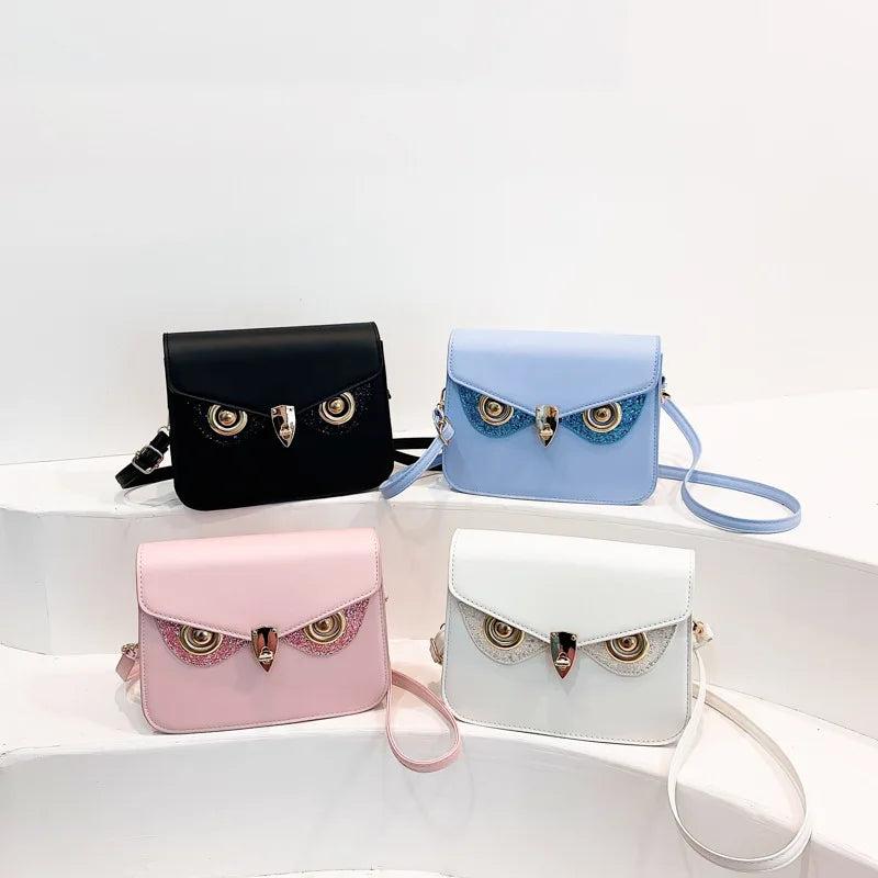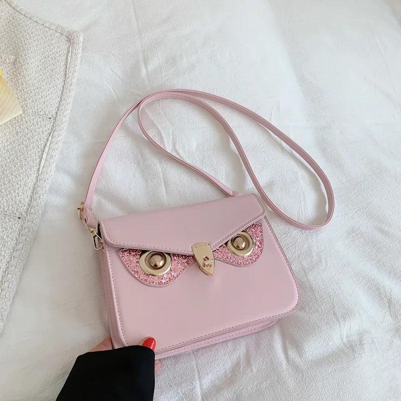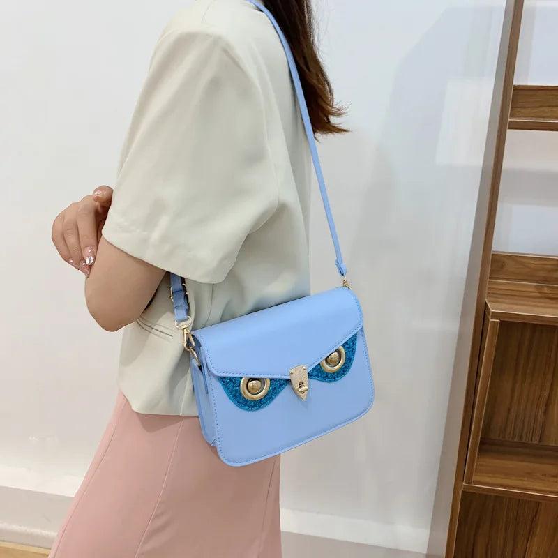 This female PU leather small square bag is stylish and elegant with a sequined owl design. It features a flap shoulder design, chains for added style, and can be used as an armpit bag.