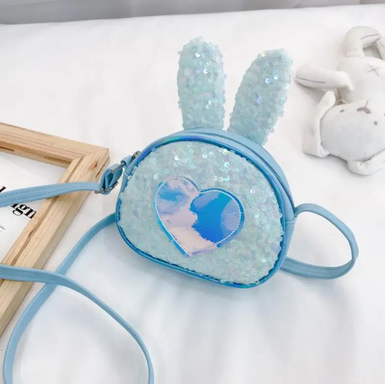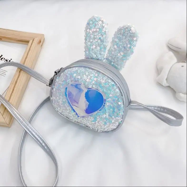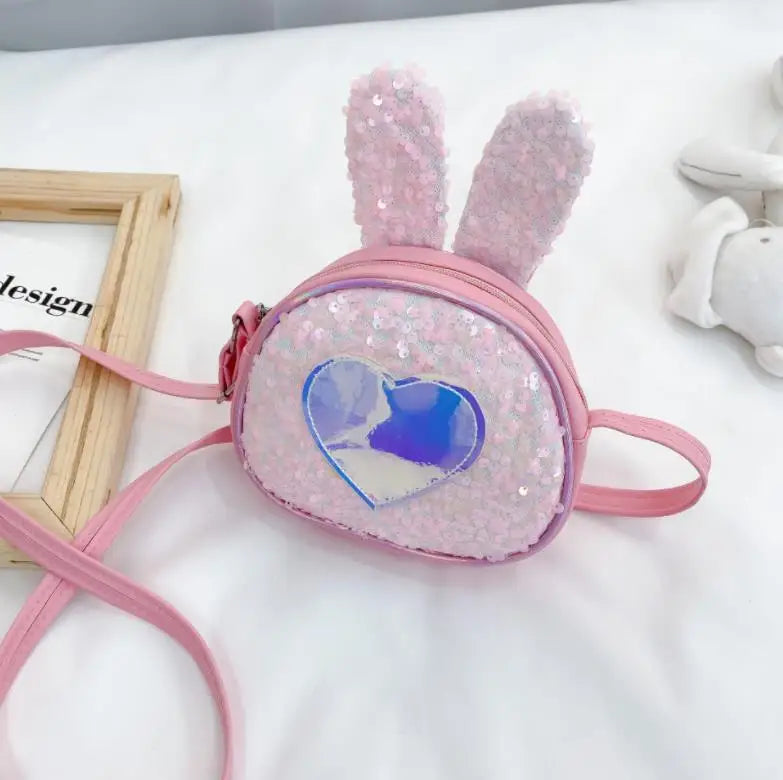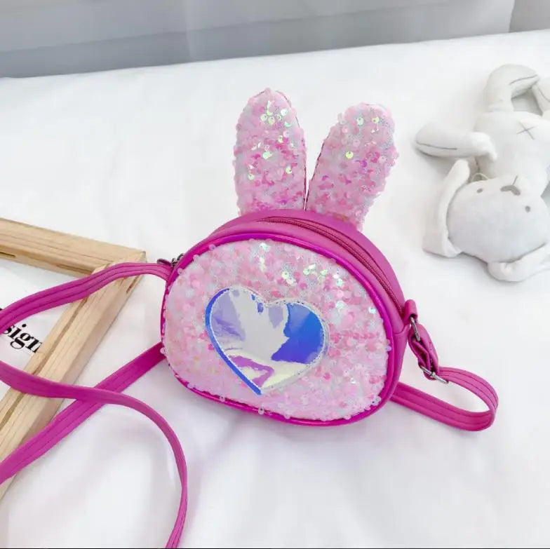 This stylish leather kid bag features a single shoulder design with a large capacity. The bag is adorned with sequined heart patterns and shaped like a cute rabbit.