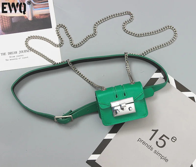 Silver Green Mini Flap Waist Bag PU Leather Chain Crossbody Lipstick