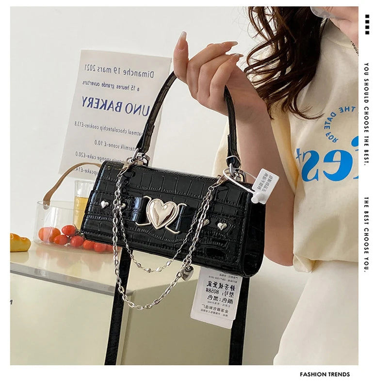 This fashionable small square bag is perfect for girls on-the-go. It can be worn as a crossbody or handheld, featuring a trendy chain strap and a one shoulder design.