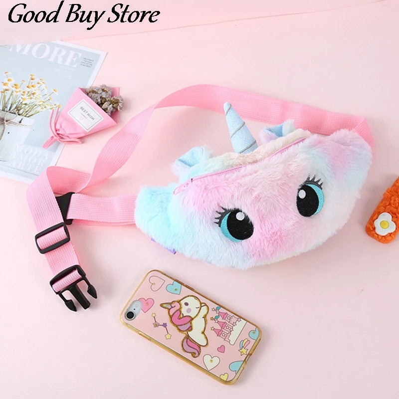 This cute unicorn waist bag is perfect for children. Made of soft fur, it features a pocket purse to hold your phone and other small items. The cartoon design adds a fun touch to any outfit.
