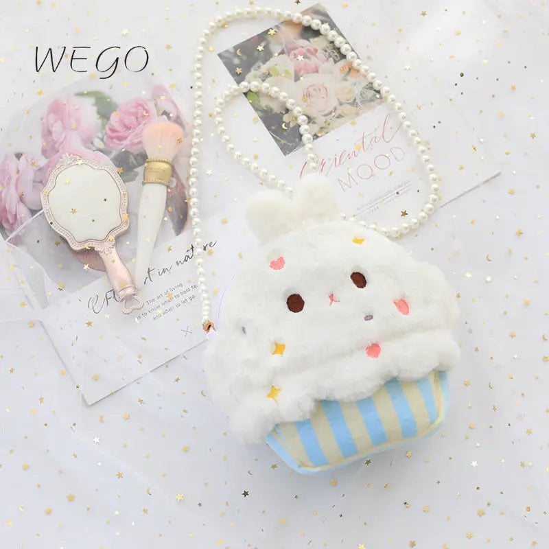 Adorable cartoon plush bag featuring a cute rabbit girl design with a pearl chain strap. Perfect for carrying small items in style.