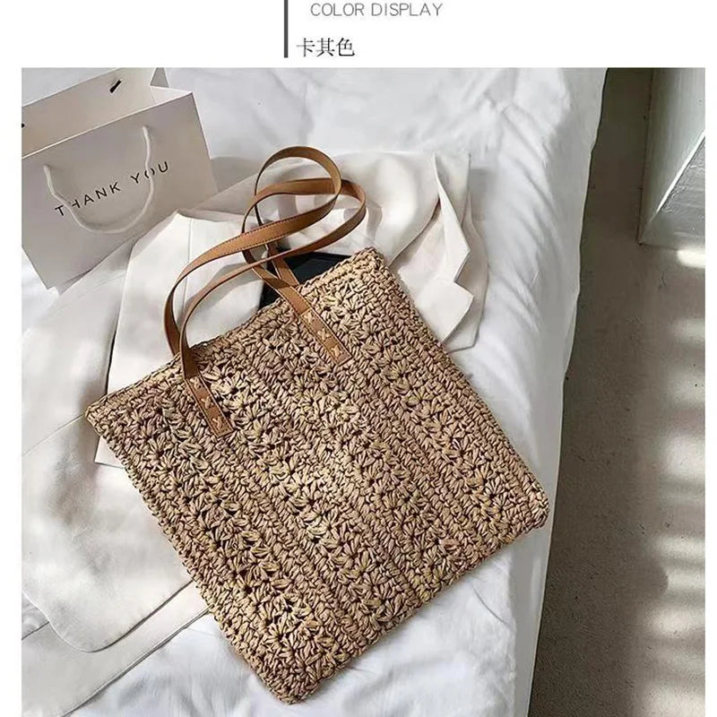Square Hollow Straw Beach Bag Woven Shoulder Bag Raffia Rattan Shopping