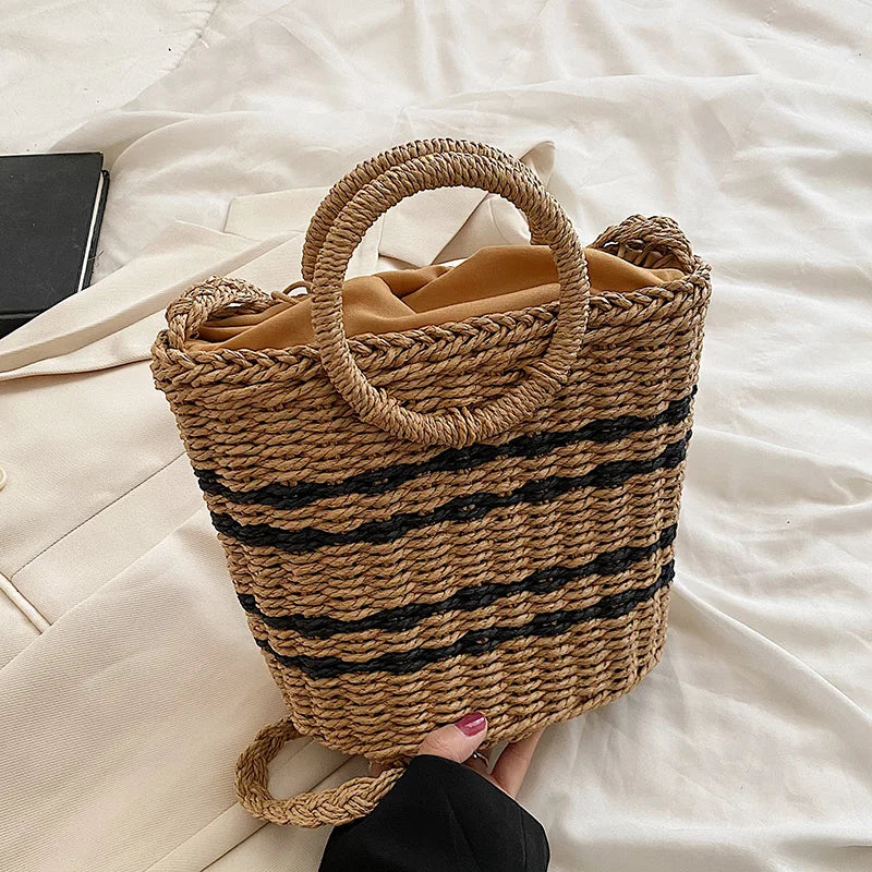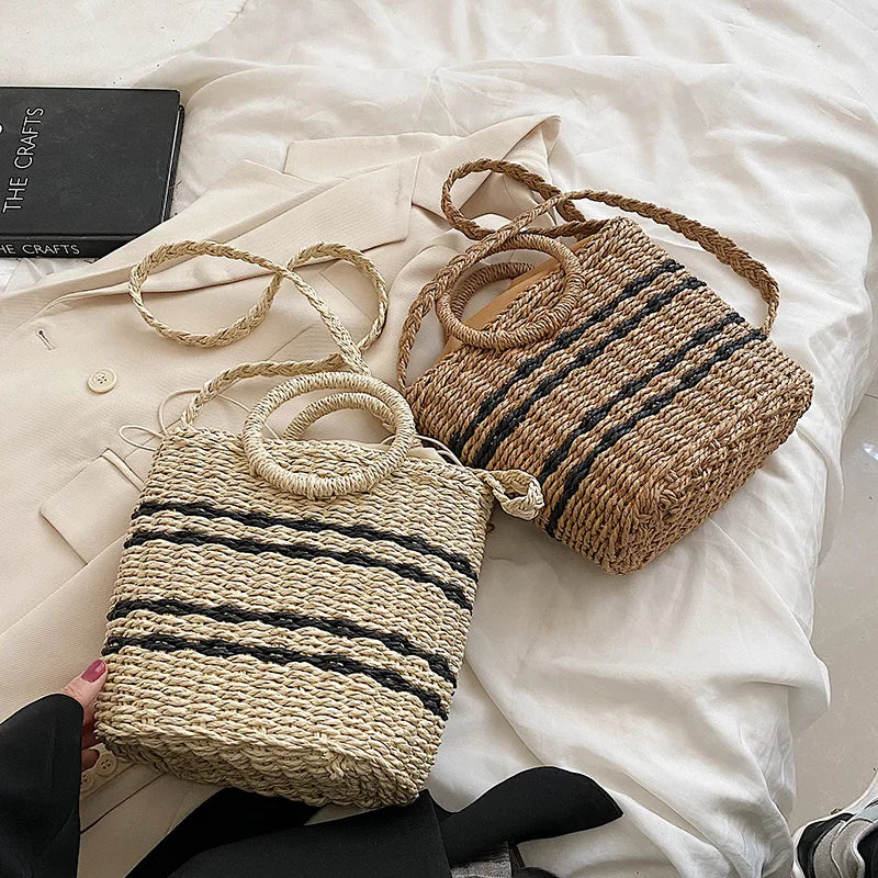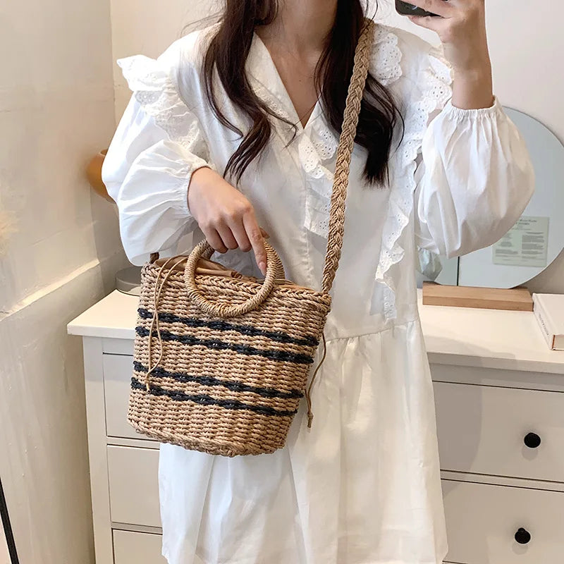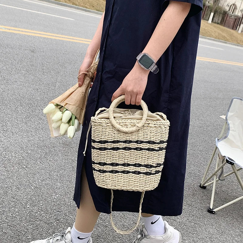 Straw Beach Bag Round Handle Rattan Shoulder Bohemian Summer Vacation