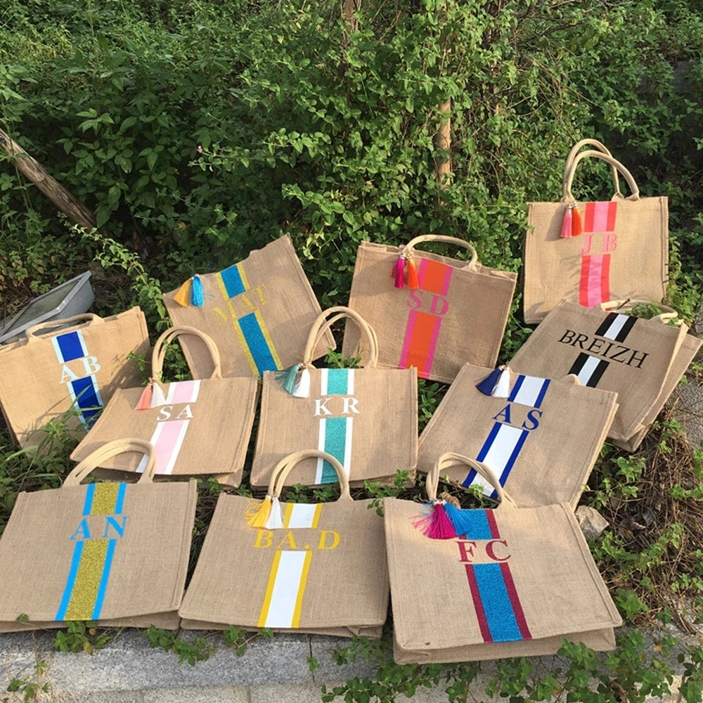 Personalize this striped beach tote with your monogram initials. Made of burlap, perfect for shopping, jutes, and pouches.