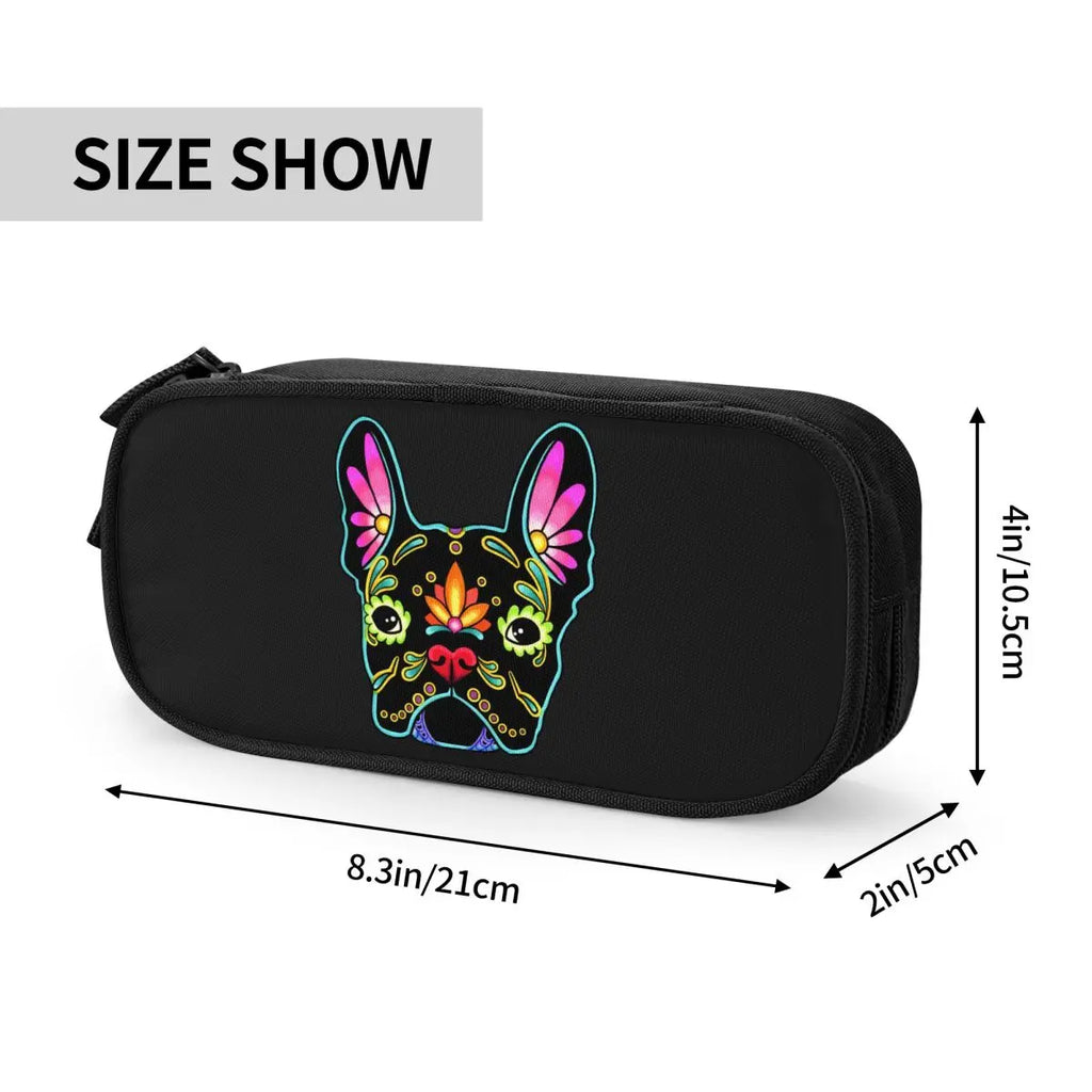 This stylish pen box features a sugar skull design of a French Bulldog, perfect for school or office use.