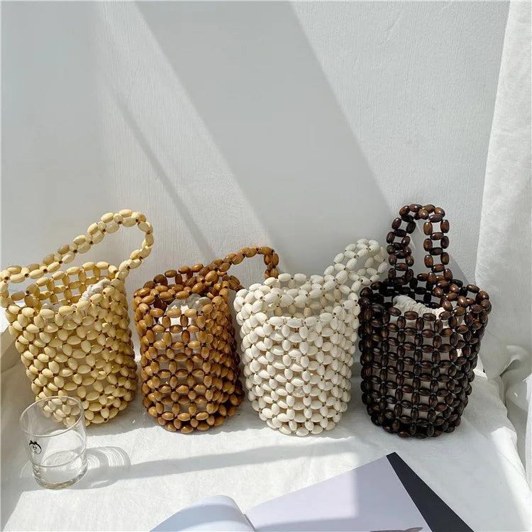 Stay stylish in the sun with this portable bucket bag featuring wooden bead accents. Ideal for beach days and summer outings.
