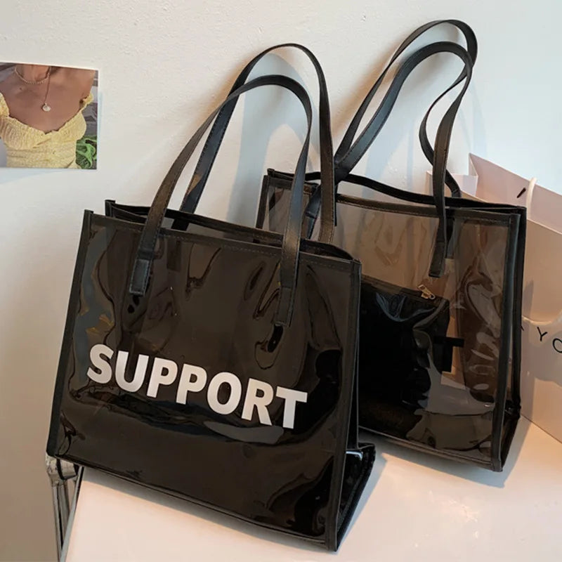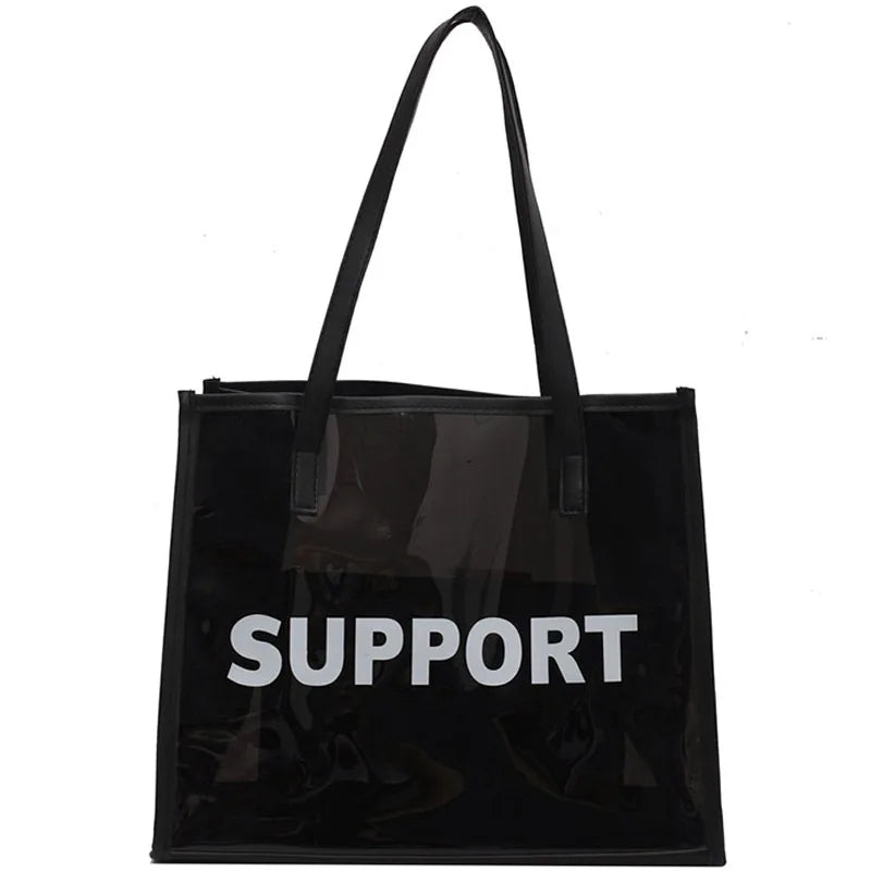 Stay stylish this summer with our large capacity transparent PVC jelly bag. Perfect for the beach or casual outings, featuring a fun alphabet print and comfortable drawstring closure.