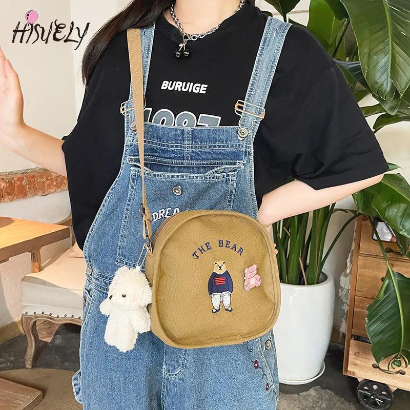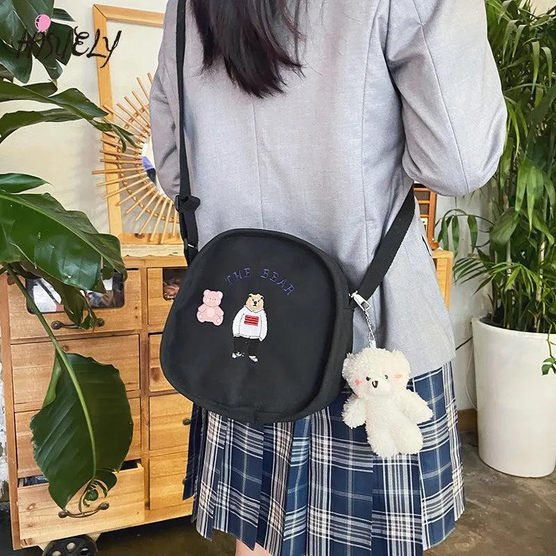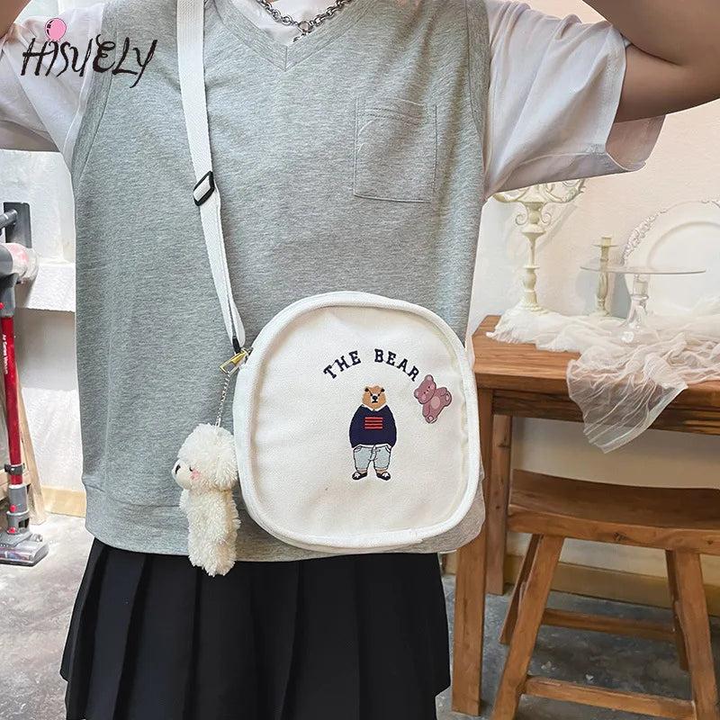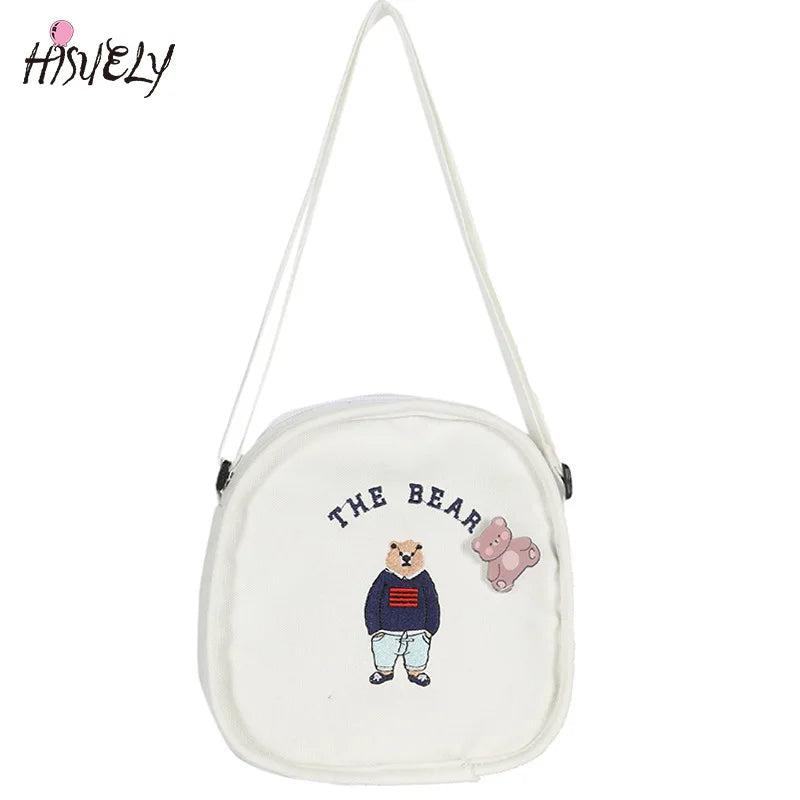 This soft student ladies messenger bag is perfect for summer outings. The oval canvas design features a cute bear embroidery.
