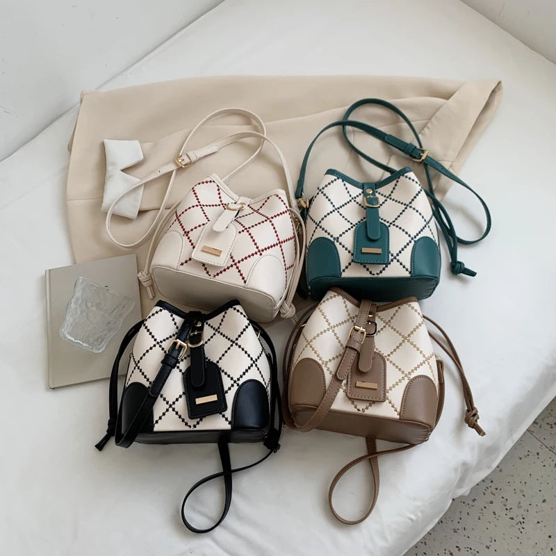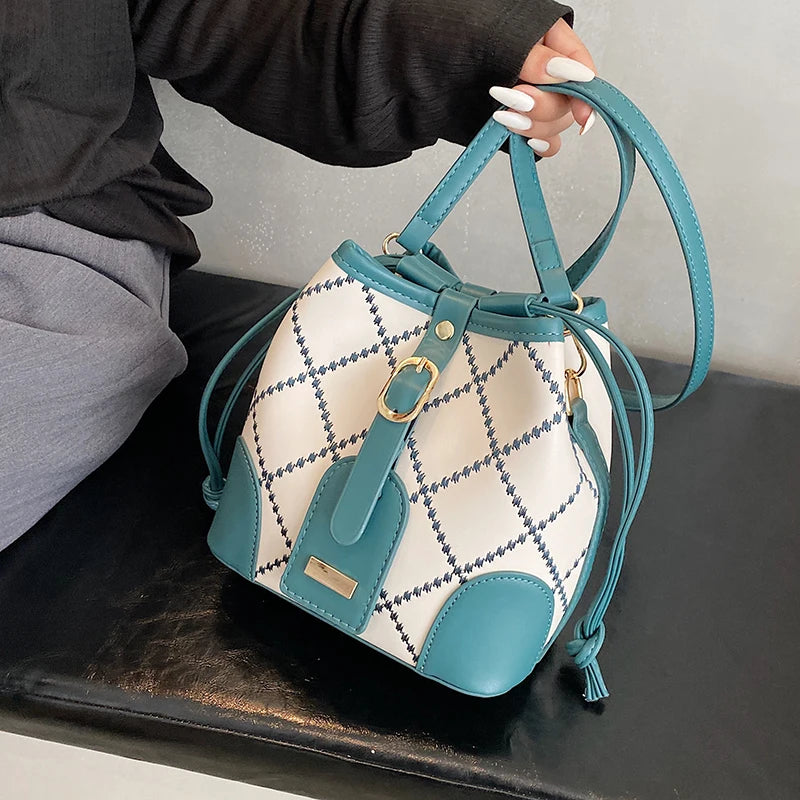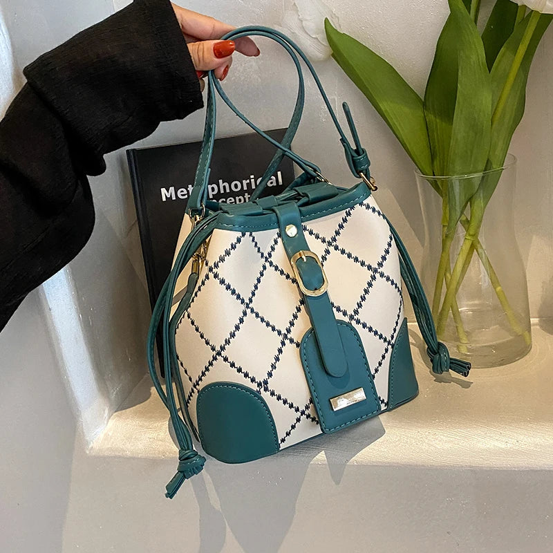 This single shoulder diagonal bucket bag features a summer-inspired rhombus embroidery thread texture.