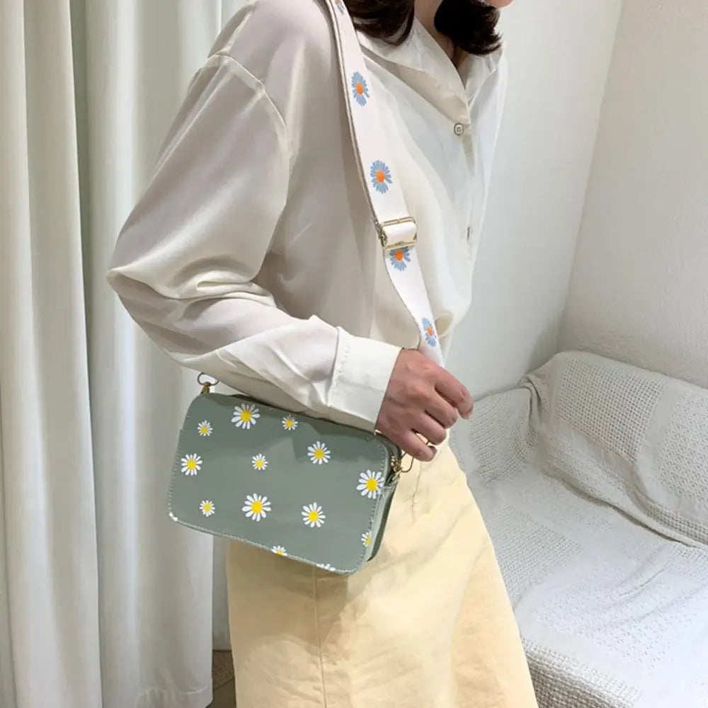 This cute small square bag features a daisy print and a wide nylon shoulder strap, perfect for summer outings.