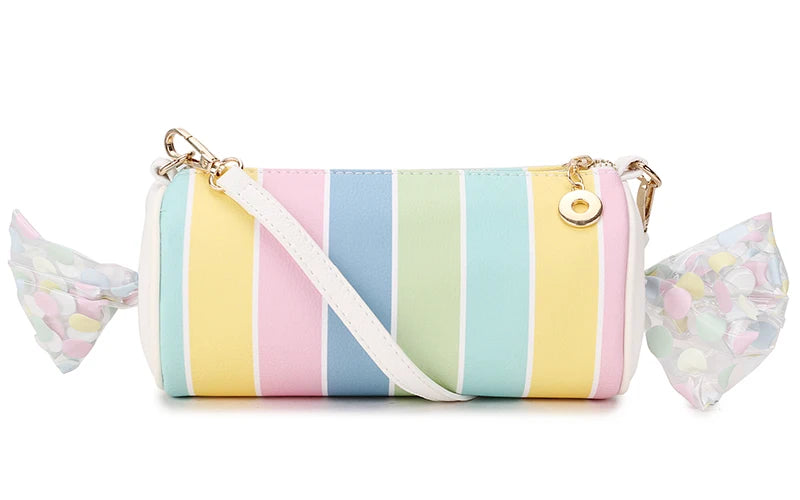 This stylish clutch bag features a sweet candy embroidered letters design on a striped PU material. It can be worn as a shoulder bag or crossbody messenger bag for a casual look.