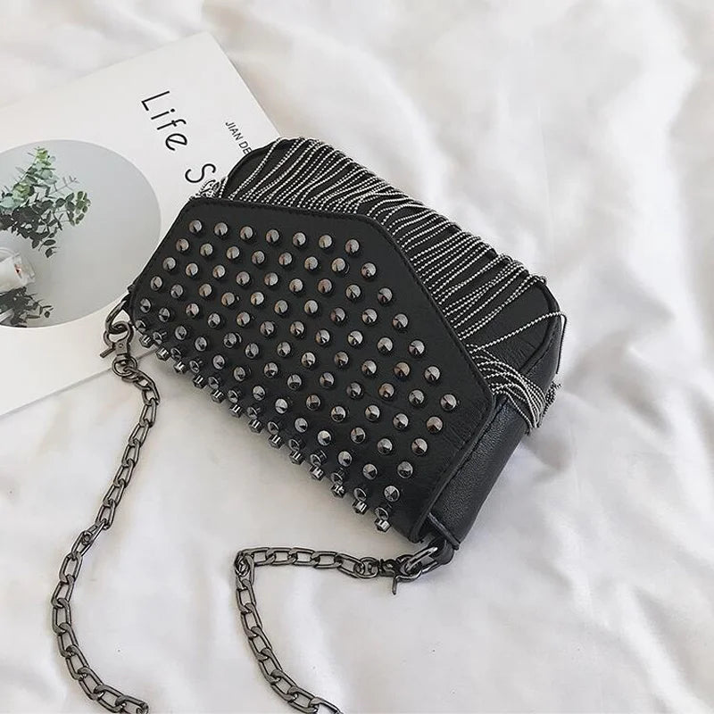 This mini chain shoulder bag features tassel diamonds and rivets, perfect for a glamorous look.