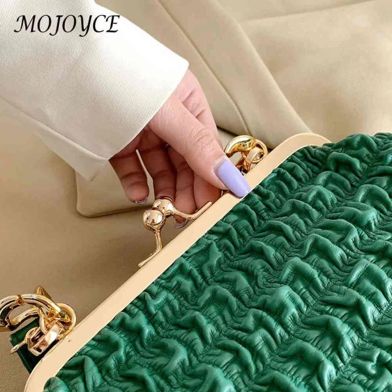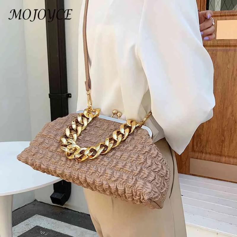 This female clutch bag features a chic pleated plaid design, perfect for evening banquets. Its thick chain strap is adjustable and has a hasp closure for security.