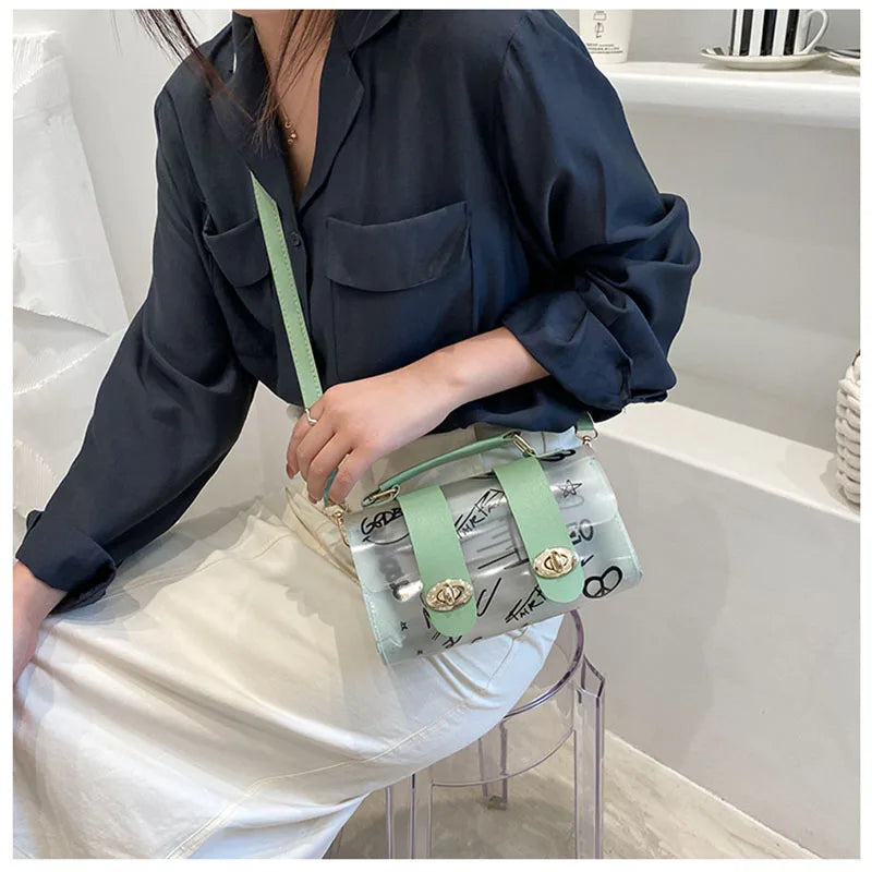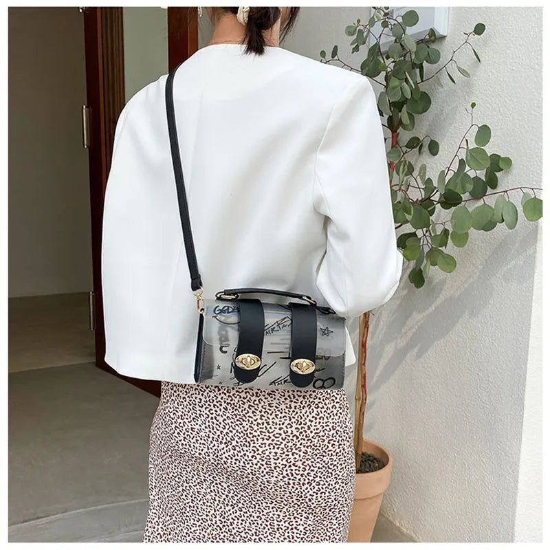 Stay stylish and on trend with this transparent female bag that features a graffiti design. Perfect for casual summer outings, this portable messenger bag adds personality to your look.
