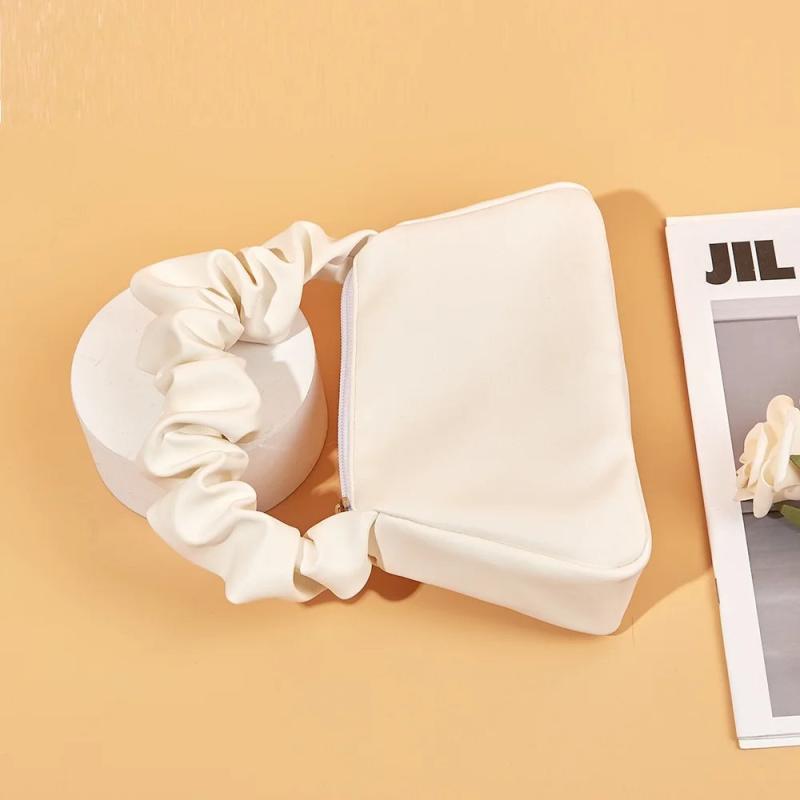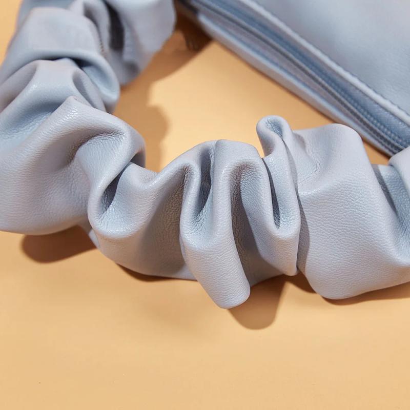 This compact cosmetic bag is perfect for travel, made of durable PVC leather in a stylish blue color.