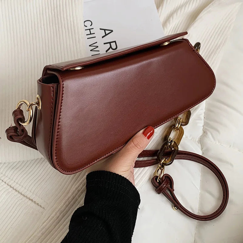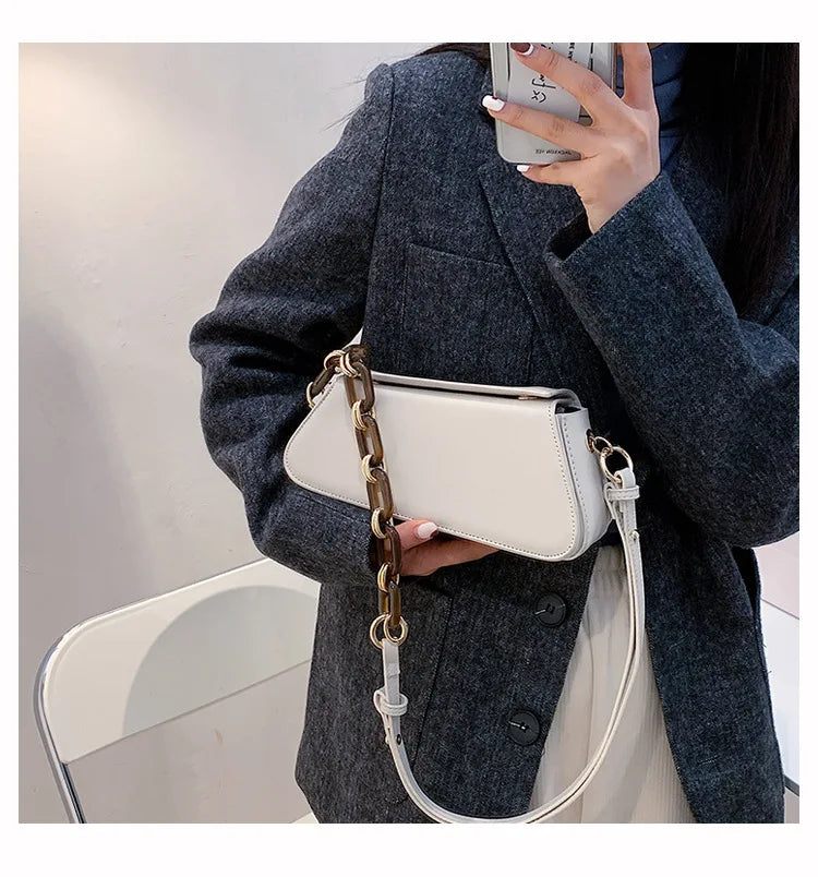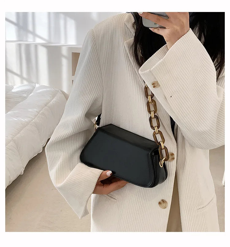 This underarm bag is perfect for females who want a wild and niche look. It features a small square design with a chain strap for a stylish touch.