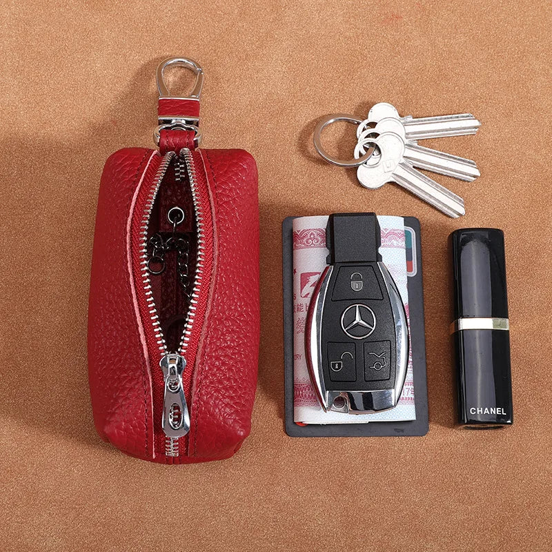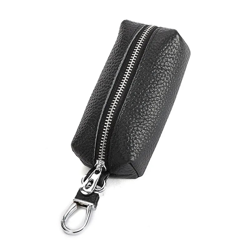 This unisex cowhide pouch is perfect for storing small items like keys, coins or other essentials. Made with high-quality cow leather, this pouch features a zipper open design and double key ring chains for added convenience.