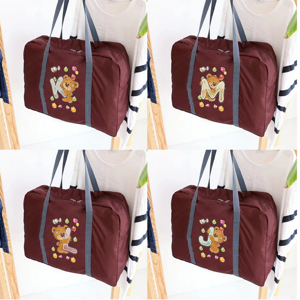 Stay organized while traveling with this large capacity foldable duffle bag featuring a bear letter series print. It's portable and perfect for all your travel needs.