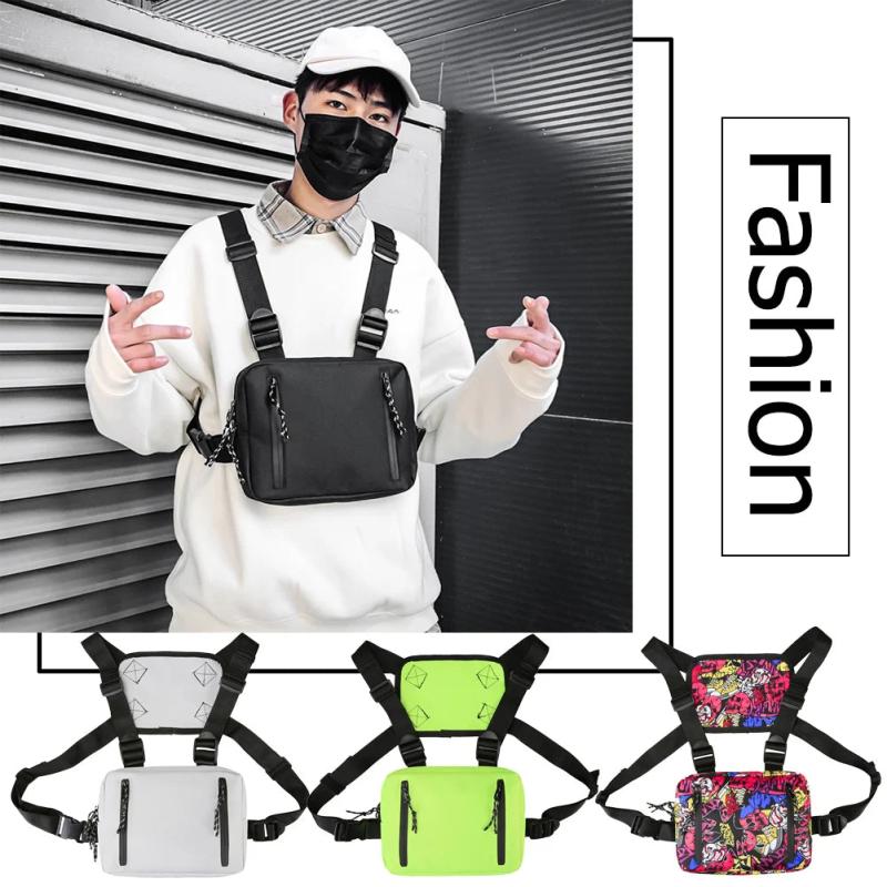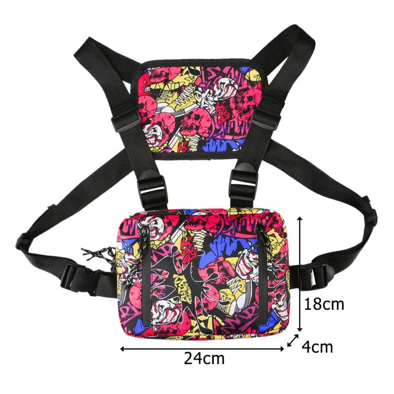 This versatile chest bag is perfect for hip hop style streetwear. Wear it as a shoulder bag, vest, or waist pack.