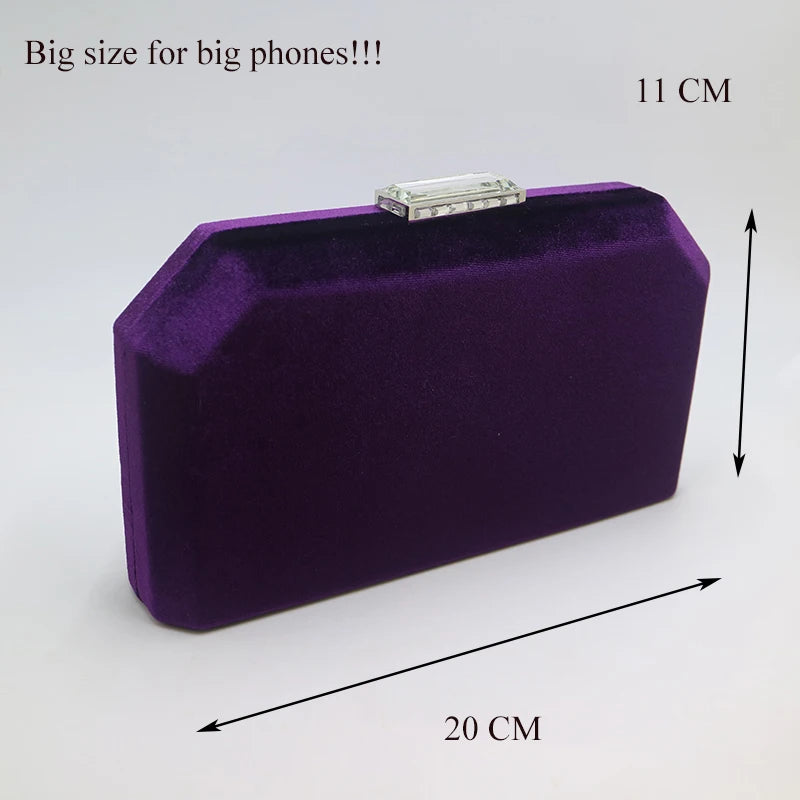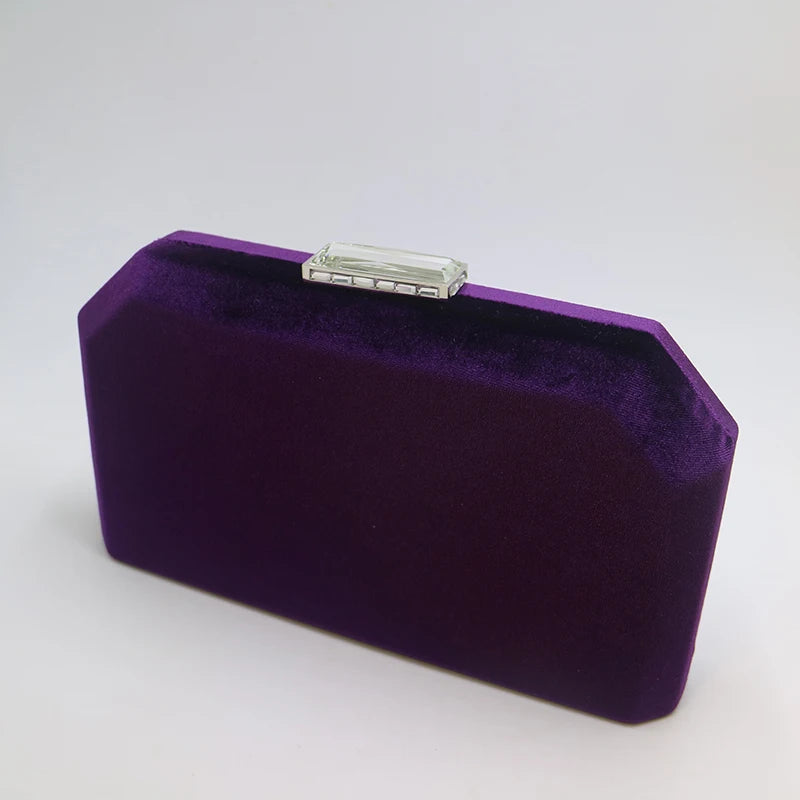 Elegant velvet fabric evening bags and clutches perfect for parties, prom, and evening events. Available in green, purple, navy blue, and red colors.