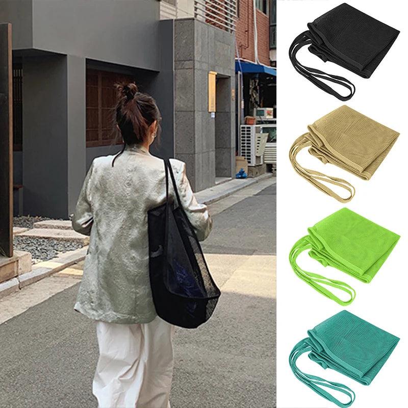 This transparent mesh shopping bag is light and versatile, perfect for carrying items on the go. It has a large capacity and is ideal for beach outings or shopping trips.