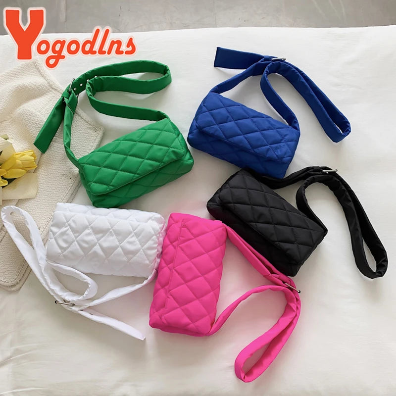 Stay warm and stylish with this padded cotton shoulder bag featuring a rhombus pattern. Perfect for carrying your essentials in the cold weather.