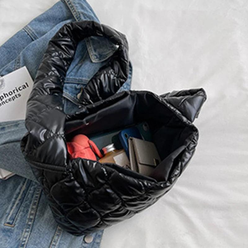 Stay cozy and stylish with this quilted shoulder bag featuring warm space cotton padding. Perfect for winter outings and everyday use.