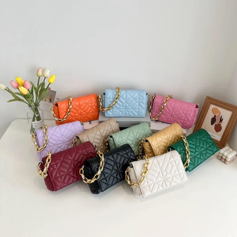 This stylish shoulder bag is made of PU leather with a diamond jacquard design. It features a flip closure and comes with a metal chain shoulder strap for a chic look.